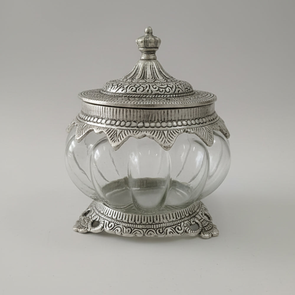 - DISEÑO ELEGANTE: Incluye 1 frasco de vidrio con tapas ornamentadas con acabado en plata antigua y diseños tradicionales.