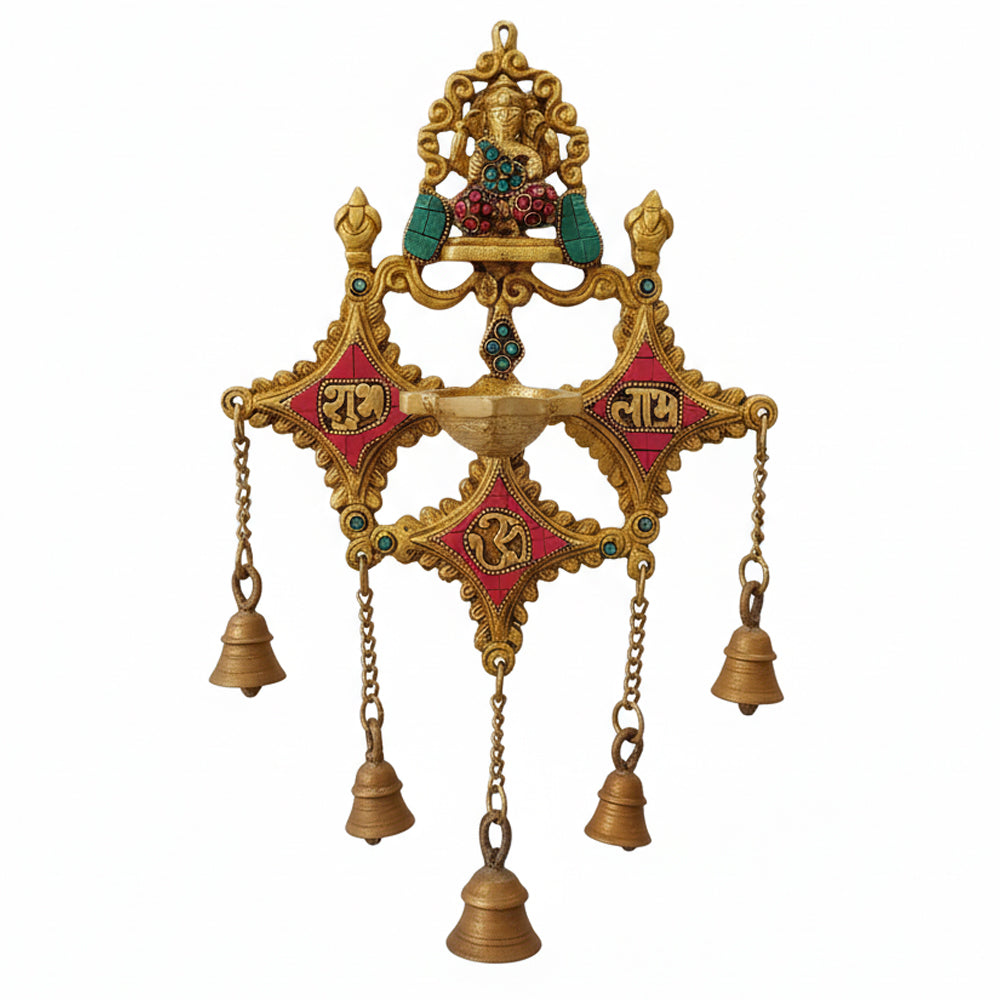 Brighten your home with the Ornativo Gemstone Work Brass Ganesha Wall Hanging . This beautiful wall hanging , crafted from high-quality brass, features intricate gemstone detailing, bringing a touch of elegance and tradition to any space. The Bells are designed with a stunning Ganesha idol at top, symbolizing wisdom, prosperity, and good fortune. It includes a traditional bells that emits a soothing chime, perfect for creating a peaceful ambiance during pooja ceremonies, festivals, and Diwali celebrations.